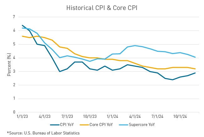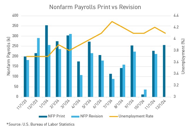 The December nonfarm payrolls and unemployment prints, released last Friday, also provided FOMC members with firm confidence that the U.S. economy is in a strong position to start the new year. The U.S. economy added 256,000 jobs in December, and the unemployment rate decreased to 4.1%, a decrease from 4.2% the month prior. Last month’s payroll gain was the largest since March, and well above the 155,000 jobs that economists had expected. The strong jobs reports have reduced any lingering concern of weakening. While the feeble labor market prints in the third quarter of 2024 may have prompted the Fed to begin cutting rates, the labor market has proven to be stronger than once feared.