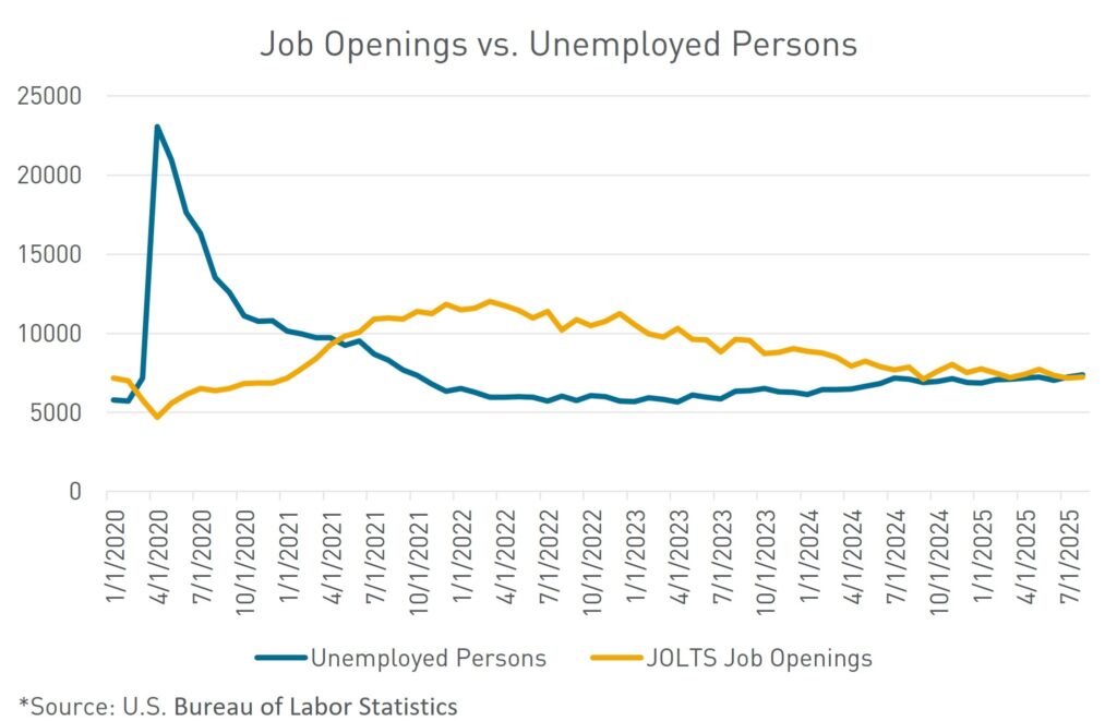 One data point on the labor market that the Fed can analyze before the next meeting is the Job Openings and Labor Turnover Survey (JOLTS) report. The U.S. JOLTS Report was released on September 30, before the government shutdown—job openings were little changed in August, while hiring was subdued, according to the Bureau of Labor Statistics. The hiring rate fell to 3.2%, the lowest since June 2024, while the number of people who voluntarily left their jobs dropped to the lowest level this year. The print highlights the continued theme of a weakening labor market, as the demand for workers remains weak. For the second straight month, the ratio of the number of job openings per unemployed worker decreased below 1:1. At its peak in 2022, the ratio was 2:1. This ratio is watched closely by Fed officials as a proxy of the balance between labor supply and demand. The sub-1:1 ratio provides evidence that any ongoing inflationary price pressures are not being caused by the labor market.