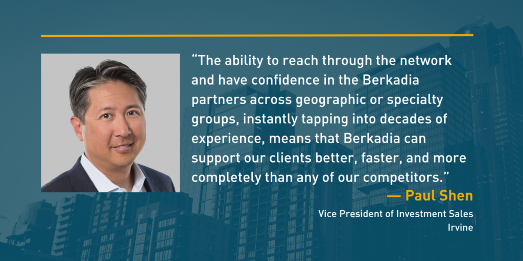 Shen joined Berkadia in 2021 following its acquisition of Moran & Company where he previously served as a director in the Orange County office. Despite his hesitancy transitioning from a small, boutique firm to a larger organization, he found Berkadia preserved the intimate, small company feel while providing superior resources, technology, and support.