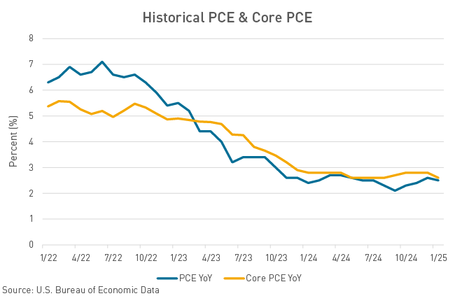 Friday’s PCE print offered some relief to the market after a string of reports suggested price pressures are heating up – particularly after the January CPI figure increased for the fourth straight month, posting the highest headline print since August of 2023. The PCE report eased tensions on the inflation front, but ongoing price pressures and policy changes, including new tariffs, may weigh on the consumer and impact inflation expectations. The core PCE index, which excludes food and energy items, rose 0.3% on a monthly basis and increased 2.6% year over year, matching the smallest annual increase since early 2021. Inflation-adjusted consumer spending fell 0.5%, marking the biggest monthly decline in almost four years amid winter weather after a robust holiday season. Fed officials have indicated they need to see a meaningful easing in inflation before they begin lowering interest rates again, especially when they factor in the uncertainty around how President Donald Trump’s policies will impact prices. The string of economic prints over the second half of February has caused the market to price in a second rate cut in 2025 – the first in June and the second in October.