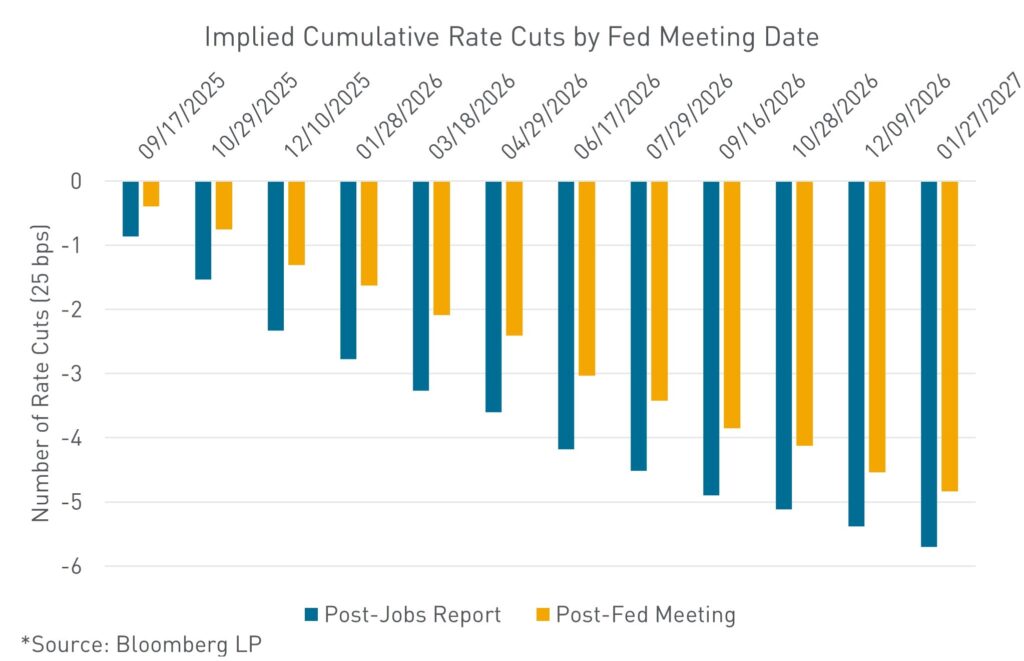 At the press conference, Fed Chair Jerome Powell set a hawkish tone—Powell stated that a wide set of indicators suggest that conditions in the labor market are broadly in balance and consistent with maximum employment. After the labor market prints today, the two dissenters—while still likely political in their objection—do feel more vindicated. Powell’s hawkish stance at the press conference caused future projections to wane. In the days before the FOMC meeting, the market projected a 68% chance of a September rate cut, dropping to 39% after his press conference, only to rally back to an almost 90% chance after Nonfarm Payrolls Friday morning.