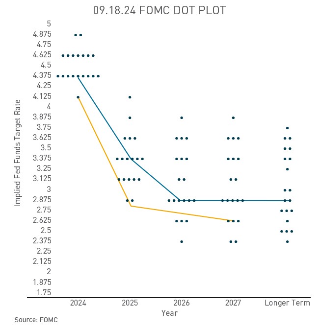 The Fed’s two-year battle against inflation seems to have finally come to an end. In their statement Wednesday, policymakers indicated that they now see the risks to employment and inflation as “roughly balanced.” The most recent Consumer Price Index (CPI) print was 2.5% with a Core CPI level at 3.2%, and the most recent Personal Consumption Expenditures (PCE) print was 2.5% with a Core PCE level at 2.6%. Recent prints have given FOMC members confidence that inflation will continue to trend towards the Fed’s 2% goal. The updated Summary of Economic Projections detailed a decrease in expected PCE level, the Fed’s preferred inflation gauge versus June forecasts. Committee members now project a 2.3% PCE level at the end of 2024, 2.1% to end 2025, and 2.0% to end 2026. In June, projections were 2.6%, 2.3%, and 2.0%, respectively. Recent inflation prints are convenient for the Fed, as it can take swift action against the weakening labor market with minimal fears of reigniting inflationary pricing pressures.