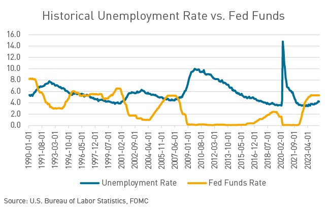 The long-awaited rate cut is finally here. On Wednesday the Federal Open Market Committee (FOMC) voted to lower interest rates by 50 basis points, the first rate cut in over four years. Wednesday’s decision marks a hard pivot in monetary policy as the Fed shifts focus from the price stability / inflation side of its dual mandate to the labor market side. “This decision reflects our growing confidence that with an appropriate recalibration of our policy stance, strength in the labor market can be maintained in a context of moderate growth and inflation moving sustainably down to 2%,” Fed Chair Jerome Powell said at Wednesday’s press conference. The Fed practiced patience in their battle against inflation, holding rates at the 5.25%–5.50% terminal rate range for nearly 14 months before pivoting in policy.