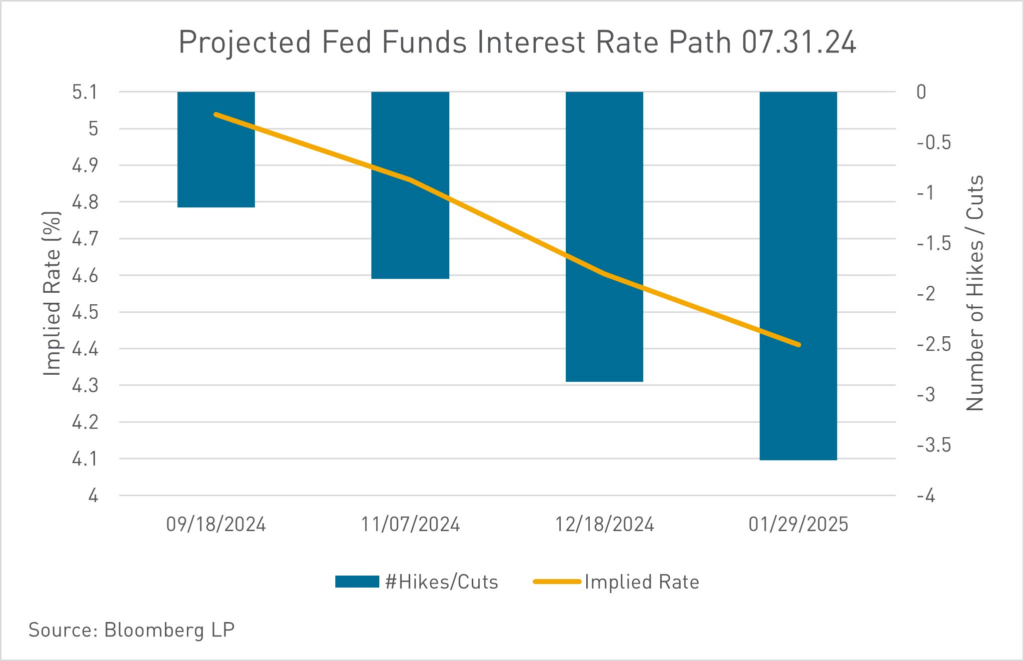 Market participants are interpreting the Fed’s announcement—plus recent inflation and labor market prints—with enough conviction to project a full rate cut at the September meeting. A total of 72 bps (nearly three full rate cuts) are currently projected before the end of the year, according to Bloomberg. Powell hinted towards the possibility of a September rate cut at his Wednesday press conference, saying, “a reduction in the policy rate could be on the table as soon as the next meeting in September. We’re getting closer to the point at which it’ll be appropriate to reduce our policy rate, but we’re not quite at that point.” Prior to the September FOMC meeting, all eyes will look towards upcoming labor market and inflation prints, as well as Powell’s remarks at the Jackson Hole Symposium, for future guidance.