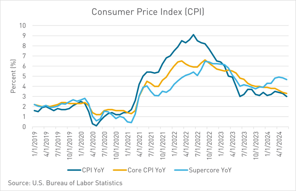 The Federal Reserve is one step closer to achieving the Goldilocks scenario of a soft landing. On Thursday morning the U.S. Bureau of Labor Statistics released the June Consumer Price Index (CPI) figures. While annual numbers were roughly in line with expectations, the monthly number of -0.1% stole the show, with deflation headlines quickly appearing. While the headline YoY CPI numbers for June of ’23 and June of ’24 are identical, giving succor to the Fed is the fact that Core CPI over the same period fell from 4.8% last year to 3.3% this year. The move lower was largely buoyed by shelter costs registering their smallest increase since 2001. This CPI print has boosted investors’ hopes that the Federal Reserve could soon start cutting interest rates, with all eyes on the September FOMC meeting.