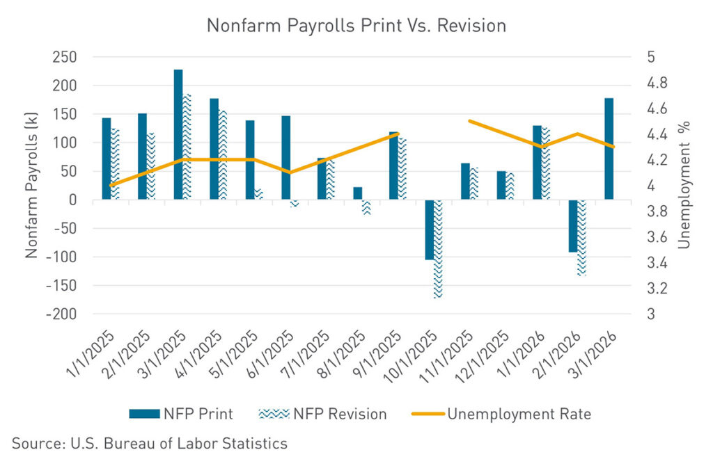 The March nonfarm payrolls report, released Friday morning, delivered a meaningful upside surprise and offered evidence that the U.S. labor market remains on solid footing despite a rapidly shifting macroeconomic backdrop. Payrolls rose 178,000, the strongest monthly gain since late 2024 and above Bloomberg survey estimates—the print follows a sharper-than-published decline of 133,000 in February. The February figure, revised down from the initially reported -92,000, was distorted by a combination of a Kaiser Permanente health care worker strike affecting more than 30,000 employees in California and Hawaii, and severe winter weather. The unwinding of both factors drove much of March’s rebound, with healthcare, construction, and leisure and hospitality all recovering. The unemployment rate fell to 4.3% from 4.4%, and given rounding conventions, the underlying rate could plausibly have printed at 4.2%.