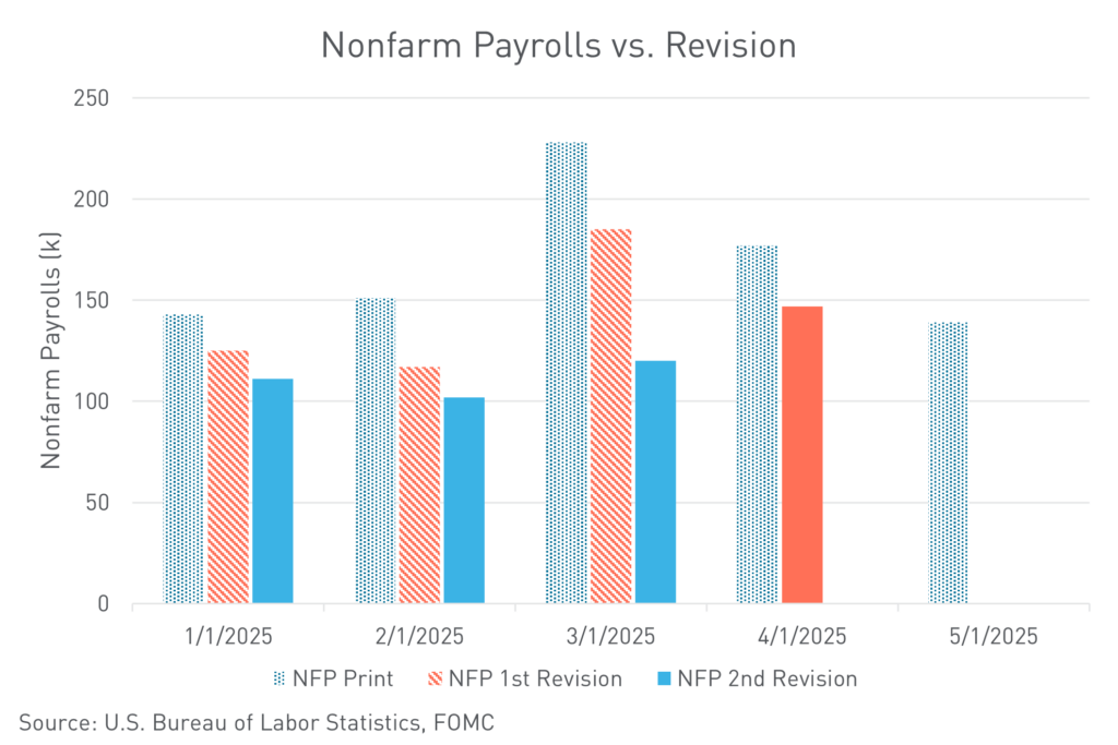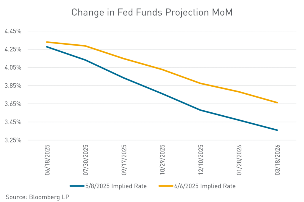 The May Nonfarm Payrolls print did not force the Federal Reserve’s hand in upcoming monetary policy decisions. Officials have indicated they’re in no rush to cut rates until they get further clarity on the impact the administration’s policies will have on the economy—including the labor market. Market expectations assume that companies plan to pass through tariff costs to the consumer in the next two to three months. Given this expectation, the market is projecting that the Federal Open Market Committee (FOMC) is unlikely to cut rates before September, even as the job market is weakening. Market projections for rate cuts in 2025 continue to fall, with only two 25 bp cuts currently penciled in for the year, down a full 25 bps since May 1.