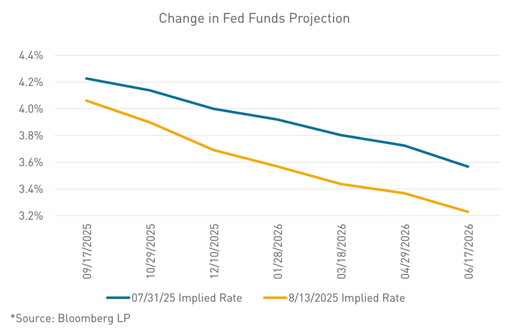The July Producer Price Index (PPI) was also released this week, and this print told a different story than the CPI figures. Wholesale prices, the cost of goods and services purchased directly from producers, rose at the sharpest monthly rate in three years, raising fresh alarm that tariffs are taking root in the economy and pushing up inflation. The producer price index increased 0.9% month over month, with services costs increasing 1.1% and goods prices excluding food and energy rising 0.4%. The report indicates companies are adjusting their pricing of goods and services to help offset costs associated with higher U.S. tariffs, despite the softening of demand in the first half of the year.