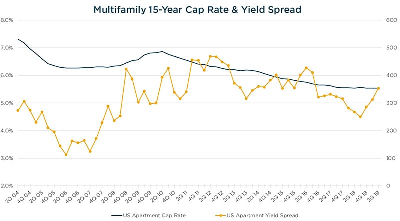 Overall, multifamily cap rates remained stable at 5.5% through the first half of 2019. Despite cap rates tightening over the past five years, the current spread between the average cap rate and the 10-year treasury remains in-line with the historical average of 327 bps (2002-2019).