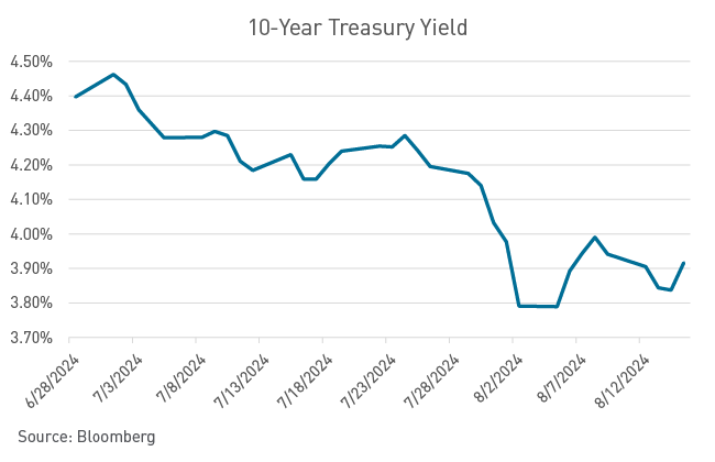 Since August 6, volatility has felt especially elevated. There were immediate calls for the Federal Reserve to cut rates before their next scheduled meeting, but these were reluctantly dismissed as the market righted itself. However, Wall Street still believes in the “Fed Put”—the idea that the Fed will lower rates if financial markets start to collapse. While the equity volatility index (VIX) has returned to July levels in the immediate aftermath of the carry trade unwind, the MOVE index (the bond market parallel) remains elevated. To point, the 10-year U.S. Treasury (UST) has had greater than a 10-basis-point intraday yield move on 63% of August trading days.